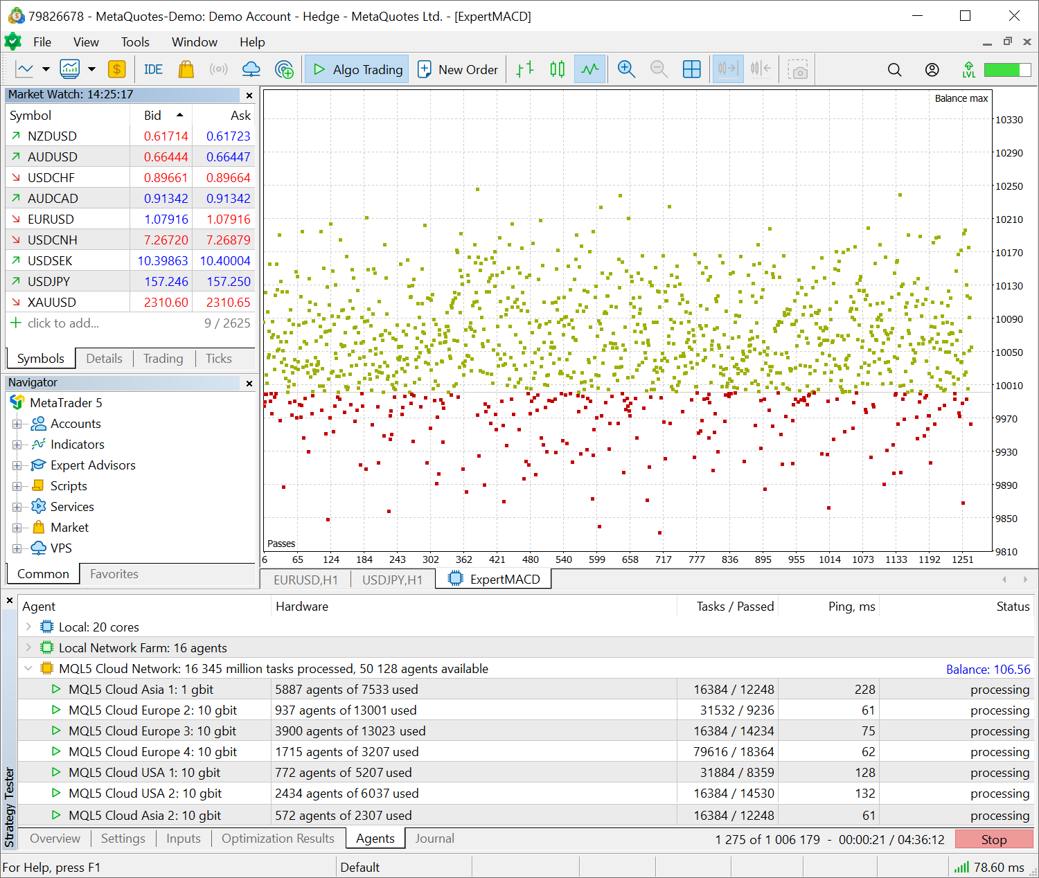 通过网络,可以轻松测试交易机器人的数百万个参数组合。用户可以即时访问数千个核心,而网络会自动分配任务和所有必要的计算参数。几分钟内即可获得结果: